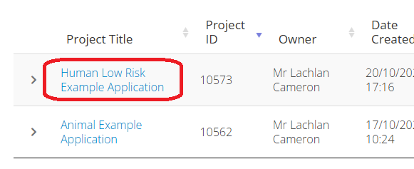 The following are example screenshots from our test system with no real live data shown (example “Human ethics low risk application”, other forms will vary)