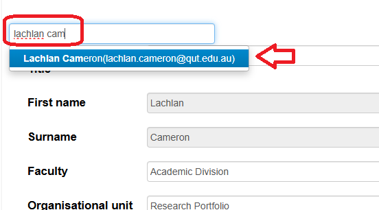 Search and then add/replace QUT staff and student details in the Project Team sections of the form by typing in the 'Search User' bar and selecting a person for their details to be auto-populated into the form.
